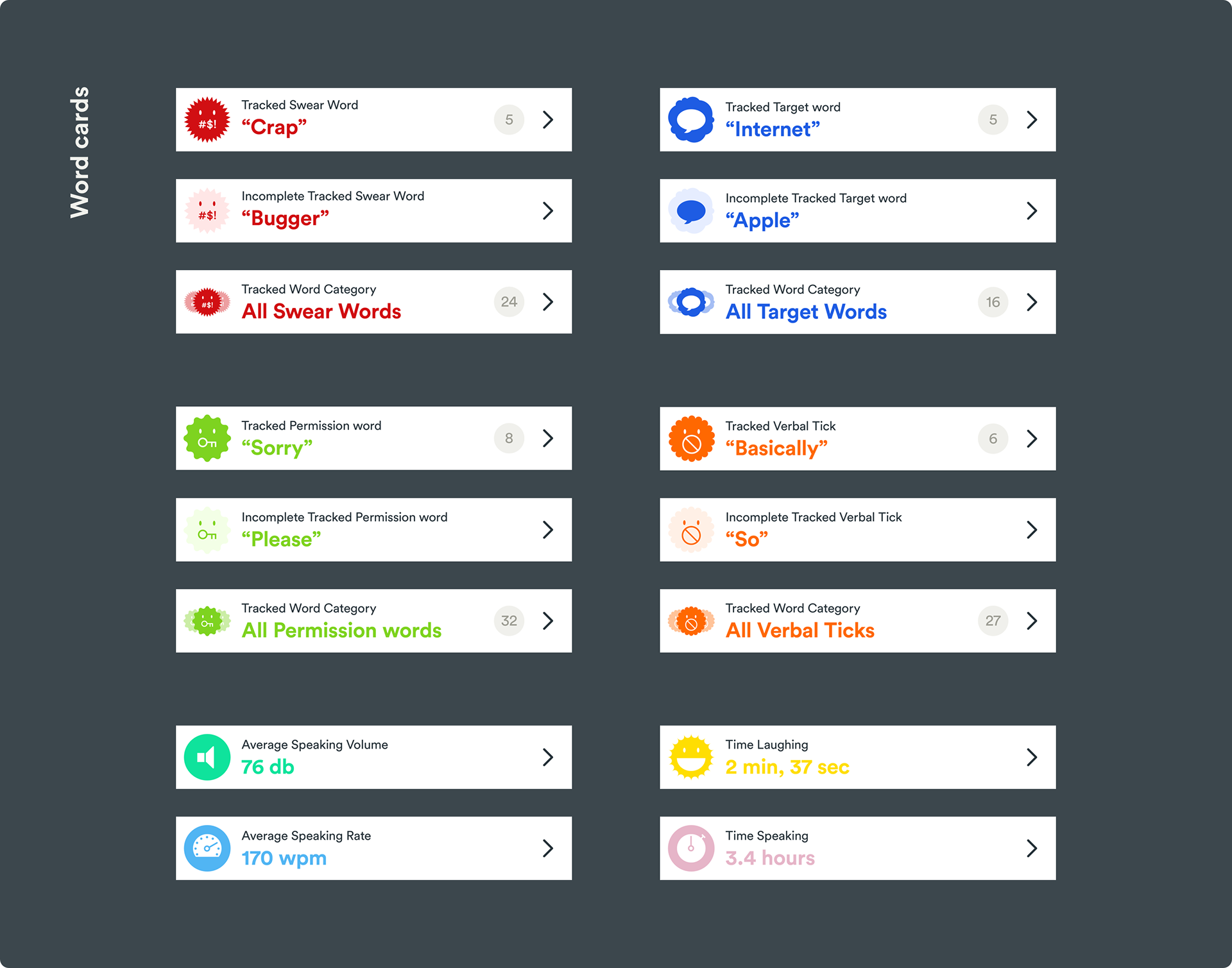 Each ball that falls from the top represents a word. When Dongl recognises that a word is either a swear word, permission word or a target word you have preset, the ball changes size and shape to indicate the trigger word it is.